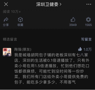 記者注意到,陶先生讓外賣小哥免費吃包子,最早引發(fā)關注,是源自疫情特殊時期他在深圳衛(wèi)健委下的一條留言:“外賣小哥在用1.5倍速播放,忙到他們想吃口飯都很麻煩,可能忙到?jīng)]時間等一份炒菜,我們所有門店給外賣小哥提供免費的包子,能吃多少拿多少,不用客氣?!?/p>