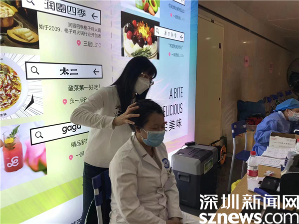 5月1日下午,老圍社區(qū)黨委書記許少瓊來到KKMALL商場負一樓的疫苗接種點,看望現場的工作人員和醫(yī)務人員,檢查當天的疫苗接種情況,并與工作人員一起動員來往行人進行加強針的接種。當她聽說負責登記的醫(yī)生因為淋雨著涼而頭疼得厲害,卻還在默默堅持時,許少瓊立刻走到醫(yī)生的身后,為醫(yī)生按摩頭部。被按摩的醫(yī)生一再說,“很舒服,輕松了很多?!逼鋵?,這一天,連續(xù)工作4個月無休的許少瓊,身體也不是很好,但她用堅強的毅力壓抑了身體的不適,以一貫的積極樂觀影響帶動著身邊的同事。