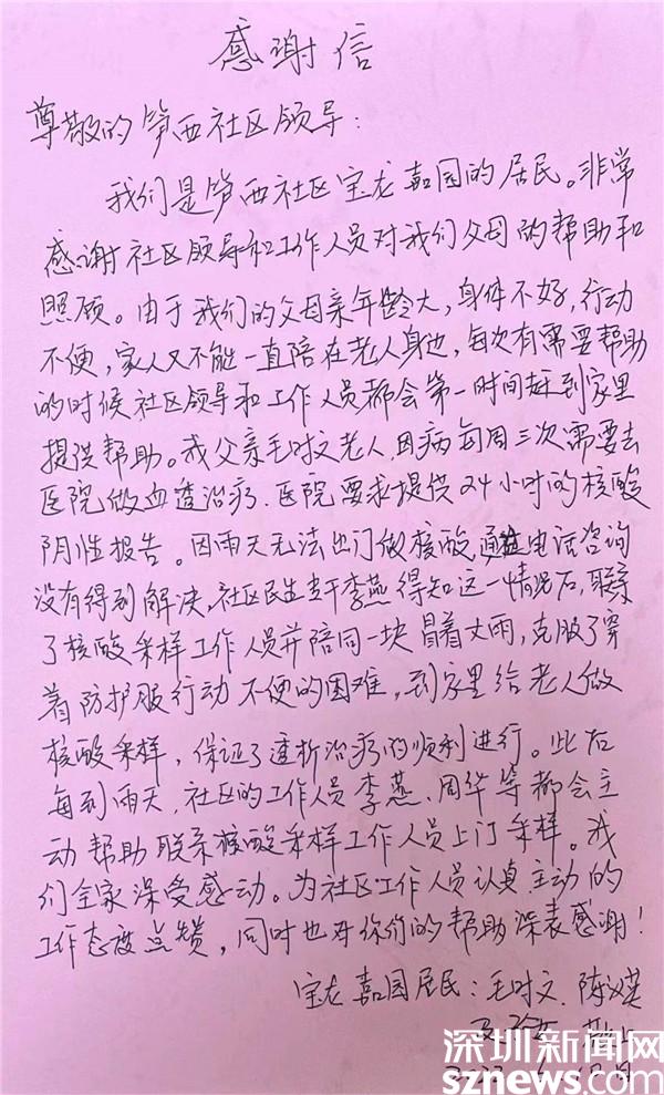 讀特客戶端·深圳新聞網(wǎng)2022年6月13日訊(記者 劉嘉敏 通訊員 李秀甜)近日,羅湖區(qū)筍崗街道筍西社區(qū)寶龍嘉園住戶毛時(shí)文的老伴陳漢英阿姨來(lái)到筍西社區(qū)工作站,送上了一封手寫(xiě)的感謝信,感謝社區(qū)提供貼心的上門(mén)核酸采樣服務(wù)。