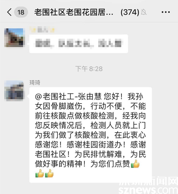 讀特客戶端·深圳新聞網(wǎng)2022年7月14日訊(記者 劉嘉敏 通訊員 楊紀歐)7月12日晚上8點多,羅湖區(qū)桂園街道老圍社區(qū)的居民琦琦在居民微信群里向社工張由慧說:“您好!我孫女因骨腳崴傷,行動不便,不能前往核酸點做核酸檢測,經(jīng)我向您反映情況后,檢測人員就上門為我們做了核酸檢測,在此衷心感謝您!感謝桂園街道辦!感謝老圍社區(qū)!為民排憂解難,為民做好事的精神!為你們點贊。”