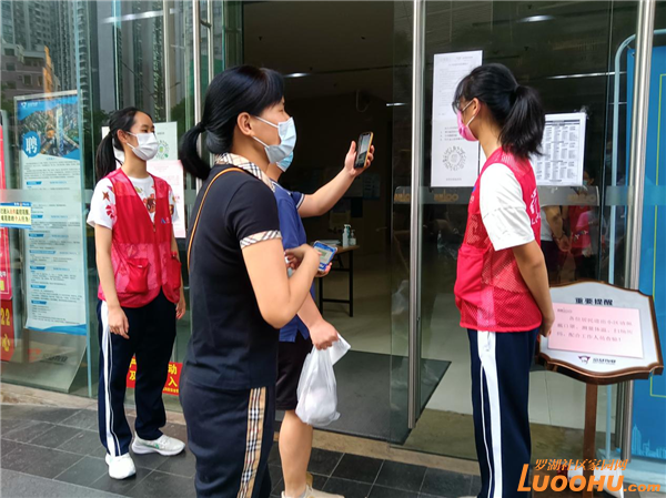 最先上陣的是一對父女兵:蔡玉堂和女兒蔡潤怡,他們利用周末時間在老圍花園E棟單元門值守。這是兩棟高層住宅,兩個單元的人都從這個門進(jìn)出。只見父女倆一個指引進(jìn)入的居民掃場所碼,一個提示測體溫、驗碼,倆人分工負(fù)責(zé),配合默契。他們都是老圍社區(qū)蔡屋圍村的居民,對自己的家園有著特殊的情感。今年12的蔡潤怡更是在這里出生長大,許多樓上樓下的鄰居都認(rèn)識她,看她做義工,都親熱地跟她打招呼,并主動配合查驗。雖然出入人員較多,但有了父女倆的值守,卡口井然有序。