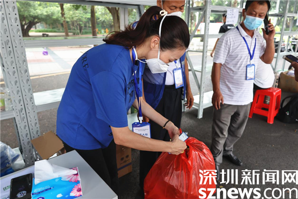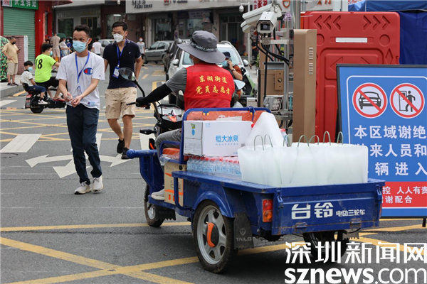 在新平村口,記者看到村口外圍已用水馬進(jìn)行合圍,來自街道、疾控、社區(qū)還有大望實(shí)業(yè)股份有限公司、梧桐山實(shí)業(yè)股份有限公司等單位的工作人員正在準(zhǔn)備開展工作。在合圍的多個(gè)出入口處設(shè)置了快遞、外賣投放點(diǎn),由防疫人員為中、高風(fēng)險(xiǎn)的居民送貨上門。
