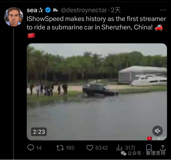 (IShowSpeed 創(chuàng)造了歷史,成為第一個(gè)在中國深圳乘坐潛水艇車的流量博主?。?/p>