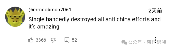 在YouTube上,“單槍匹馬摧毀了所有的反華努力,這太神奇了”“中國被低估了,簡直難以置信”“這次旅行是中國有史以來最好的宣傳”“在我看來深圳是中國最好的城市。有邁阿密的天氣、空氣和景觀,有紐約的摩天大樓,有上海的國際氛圍,有重慶的科技和賽博朋克美學(xué),還帶點(diǎn)廣東味”這樣的感嘆不勝枚舉。