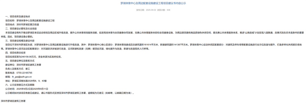 記者查詢了羅湖區(qū)人民政府官網(wǎng)信息,羅湖體育中心已納入總投資24.62億元的升級改造項目,核心區(qū)將新建建筑面積約14.14萬平方米,配套設(shè)施與濱河運動區(qū)也將全面提質(zhì)。目前該項目已取得《建設(shè)工程規(guī)劃許可證》,進入施工準(zhǔn)備階段,未來將打造集賽事、健身、休閑于一體的綜合性體育綜合體。