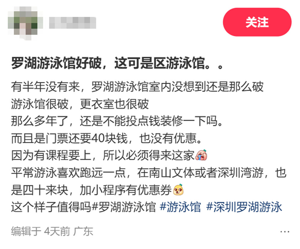 據(jù)市民反饋,場館儲物柜部分柜體破損嚴(yán)重,開關(guān)不便且存在安全隱患,同時沖涼房、衛(wèi)生間等配套區(qū)域也存在保潔不及時、環(huán)境臟亂等情況,影響游泳體驗。另有市民質(zhì)疑 “收費偏高”,認(rèn)為單次 40 元的室內(nèi)泳場票價與老舊設(shè)施不相匹配。