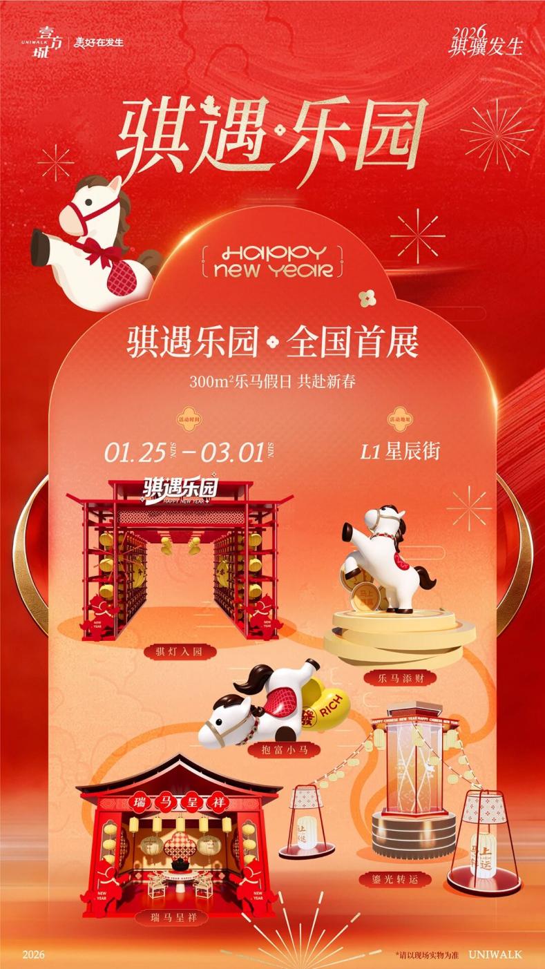 前海壹方城騏遇樂(lè)園全國(guó)首展正式啟幕,持續(xù)展出至3月1日,300平方米沉浸式新春主題空間帶來(lái)別樣年味:樂(lè)馬化身新春使者,串聯(lián)非遺表演、超級(jí)大變裝、巨型機(jī)甲、品牌快閃與超值福利,打造集文化體驗(yàn)、潮流打卡、購(gòu)物狂歡于一體的新春盛會(huì),邀大家共赴2026騏驥新歲之約。