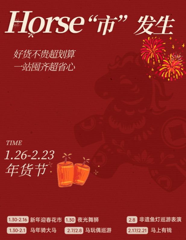 壹方天地以“壹方開(kāi)喜?HORSE發(fā)生”為主題,圍繞馬年生肖元素,打造了集沉浸式展覽、非遺市集、演藝巡游、優(yōu)惠福利于一體的新春體驗(yàn),讓你在逛市集、品美食、玩游戲中感受濃厚年味。