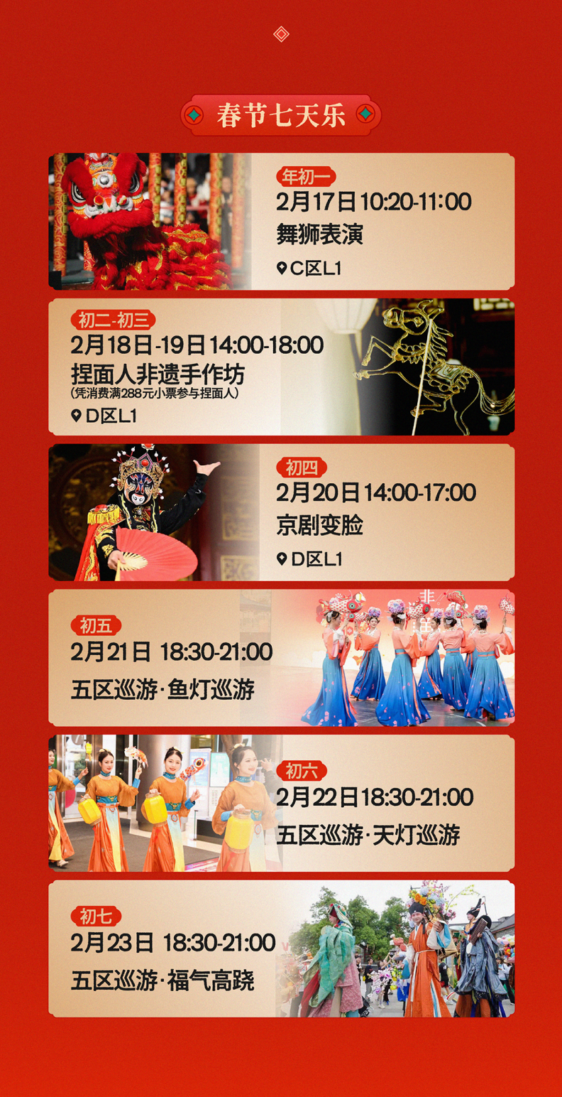 此外,初一至初七,七天樂(lè)開(kāi)懷。2月17日,舞獅表演;2月18日—19日,捏面人非遺手作坊(憑消費(fèi)滿288元小票參與捏面人);2月20日,京劇變臉;2月21日,五區(qū)巡游·魚(yú)燈巡游;2月22日,五區(qū)巡游·天燈巡游;2月23日,五區(qū)巡游·福氣高蹺。