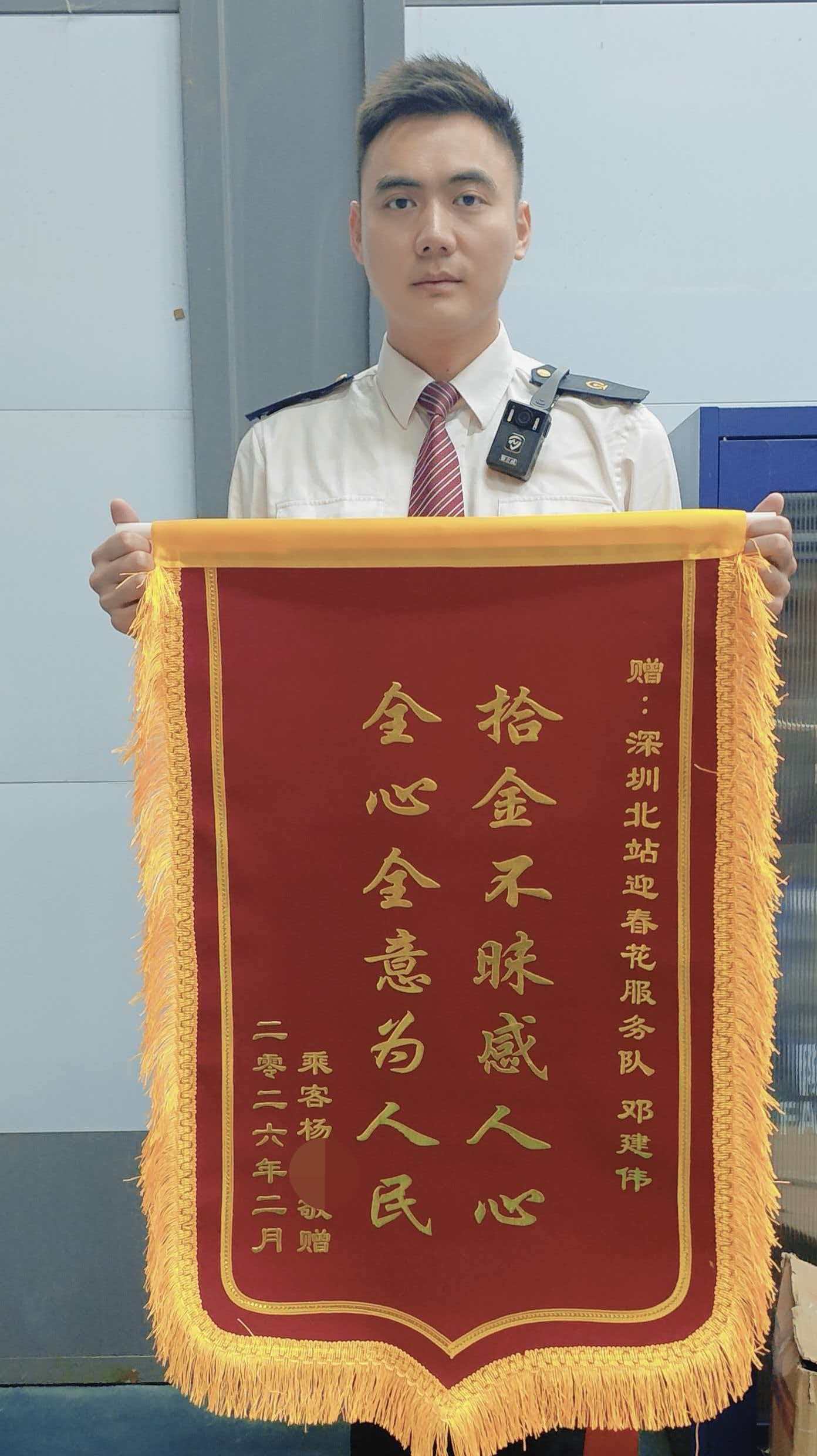 深圳新聞網(wǎng)2026年2月11日訊(記者 韓翔 通訊員 胡福祥)2月9日12時(shí)46分,深圳北站“迎春花”服務(wù)隊(duì)隊(duì)員鄧建偉收到了一面印有“拾金不昧感人心,全心全意為人民”字樣的錦旗,讓他心里暖乎乎的。這面來自旅客楊女士的錦旗,將他拉回到幾天前那個(gè)緊張而溫暖的13分鐘。