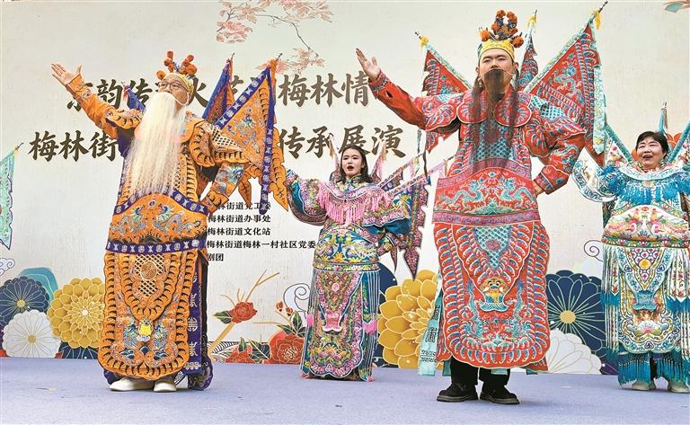 古荔林里不算寬敞的戲臺(tái)邊,擠滿了居民。有一起唱和的蒼顏老者,有看變臉時(shí)瞪大雙眼的孩童,有路過被吸引住的游客……每次聽聞“下一個(gè)節(jié)目表演者是梅林居民”,臺(tái)下的掌聲總是分外熱烈。現(xiàn)場(chǎng)的一位老人眼眶有些濕潤(rùn),“小時(shí)候我們也是一群小孩坐在戲臺(tái)下,熱熱鬧鬧的,總喜歡把自己代入到戲里,幻想著以后也成為頂天立地的大英雄……”
