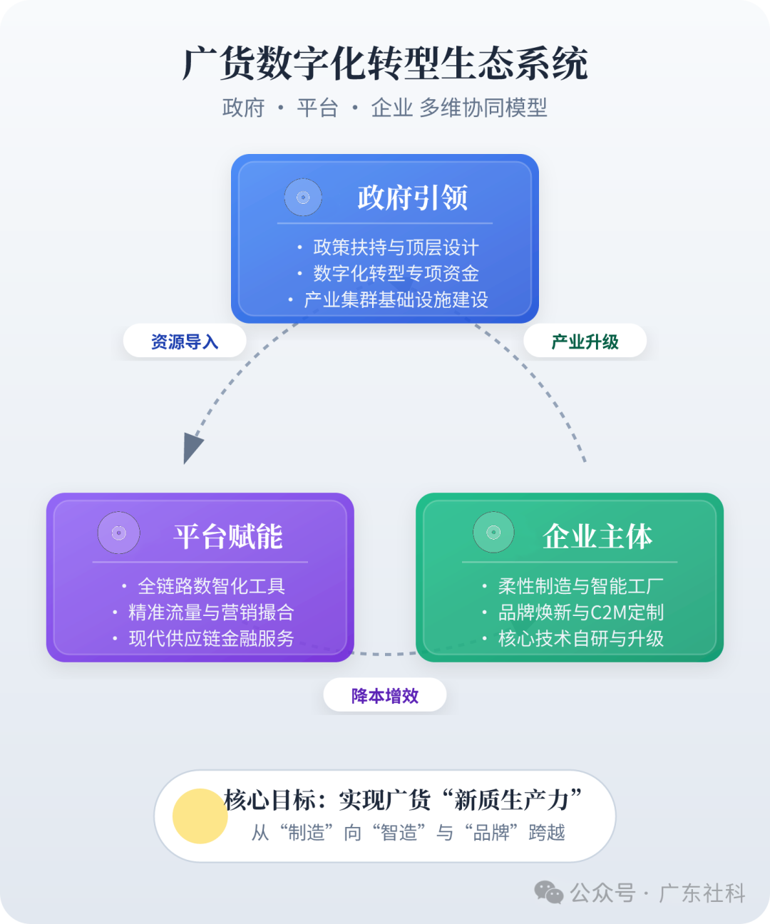 如此系統(tǒng)性的文化轉(zhuǎn)譯與價值重塑,絕非任何一家企業(yè)單打獨斗所能實現(xiàn)。廣東在實踐中,摸索出一條“政府搭臺、平臺助力、企業(yè)唱戲”的協(xié)同路徑,以AI為紐帶,構(gòu)建起一個支撐全域數(shù)字化轉(zhuǎn)型的良性生態(tài)。