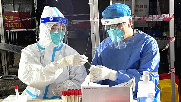 6月20日下午,在深圳市羅湖區(qū)東湖街道布心花園核酸檢測(cè)點(diǎn),羅湖區(qū)婦幼保健院兒童保健科康復(fù)治療師李忠麗在核酸檢測(cè)現(xiàn)場(chǎng)突發(fā)暈眩,隨即被扶至一旁休息,隨后由其丈夫羅湖區(qū)婦幼保健院兒童保健科康復(fù)治療師任雨替補(bǔ)上陣。