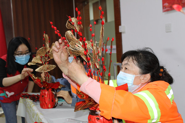 2月4日,適逢農(nóng)歷小年,社工以邀請(qǐng)函的形式,邀請(qǐng)了轄區(qū)企業(yè)員工、城中村保潔員,以及社區(qū)高齡空巢老人、獨(dú)居老人等,齊齊插年花。
