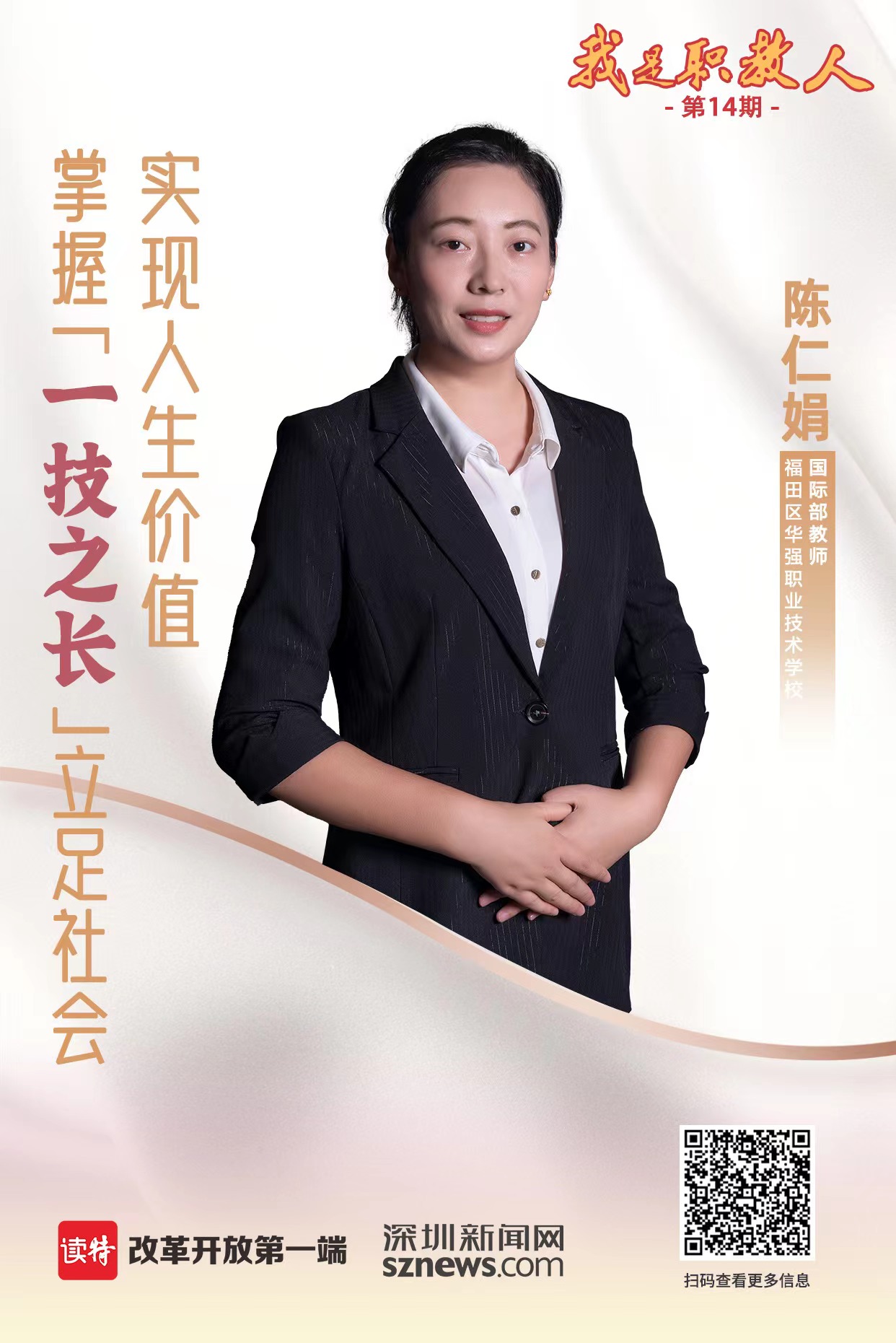 抱著對教師行業(yè)的熱愛和教書育人的向往,深圳市福田區(qū)華強職業(yè)技術學校國際部教師陳仁娟,畢業(yè)后遵循從教初心,成為職教老師至今已有九年。