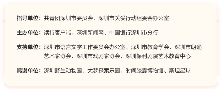 為助力建設(shè)良好的青少年閱讀環(huán)境,激發(fā)學(xué)生閱讀興趣,倡導(dǎo)親子閱讀,共建和諧家庭關(guān)系。2021年,“誰是故事大王·第五季”在共青團(tuán)深圳市委員會、深圳市關(guān)愛行動組委會辦公室的指導(dǎo)下再出發(fā)。更長的活動周期,更豐富的參與形式,更專業(yè)的賽制,等你來解鎖與挑戰(zhàn)!讓閱讀成為最動人的風(fēng)景,讓故事的魅力感動深圳。說明:所有參賽者報名成功后,均承認(rèn)并允許主辦方將個人參加本次活動的照片或視頻相關(guān)資料刊發(fā)在各類媒體雜志報紙上,用于活動宣傳。