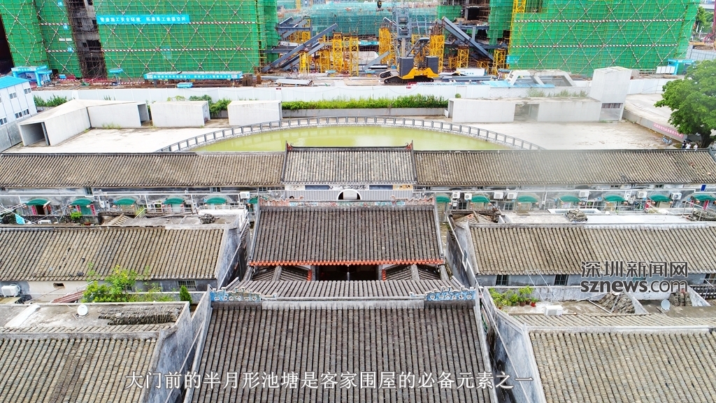 我們到訪西埔新居的時候,周邊的工地正如火如荼開工,運(yùn)送建筑材料的貨車從西埔新居一側(cè)的通道進(jìn)進(jìn)出出,站在圍屋前的半月形池塘,就可看到高大的吊車和迅速長高的現(xiàn)代樓宇,村里安靜,村外喧囂,兩個世界。