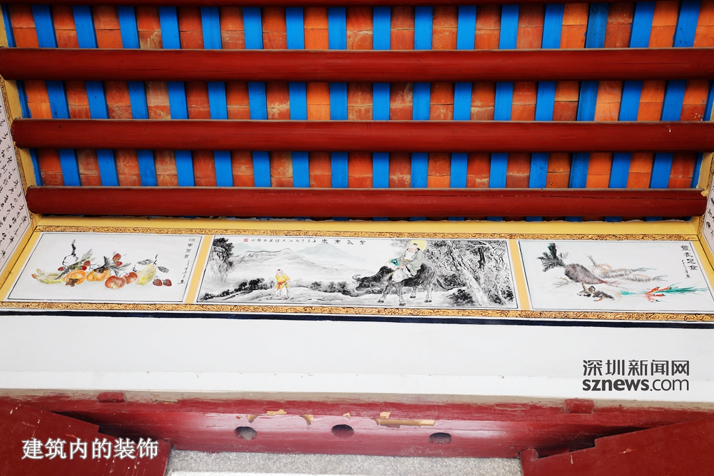 客家圍屋被稱為“東方城堡”,西埔新居的建造者們同樣也嚴(yán)格遵循古法“造城”,近3米高的白褐色外墻將99間房屋圍成一個方形堡壘,如同一座城堡。圍屋核心的李氏宗祠歷經(jīng)歲月洗禮,屋頂飛檐飾以仙鶴、麒麟、鹿等吉祥物,外壁上繪著山水畫,宗祠內(nèi)雕梁畫棟。以李氏祠堂為中軸線,左右對稱的99間居民房屋成行成列。圍屋內(nèi)巷道縱橫交錯,居民家內(nèi)收拾得干干凈凈,很是整潔,門口還種有花草,生活的樂趣撲面而來。
