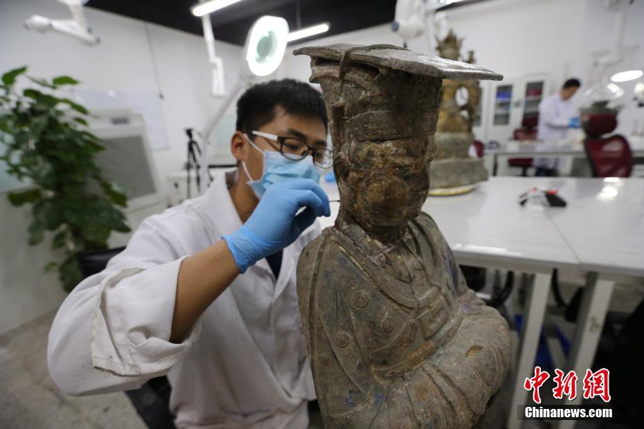 “文物醫(yī)生”在“文物修復(fù)室”內(nèi)工作。中新社記者 張遠 攝