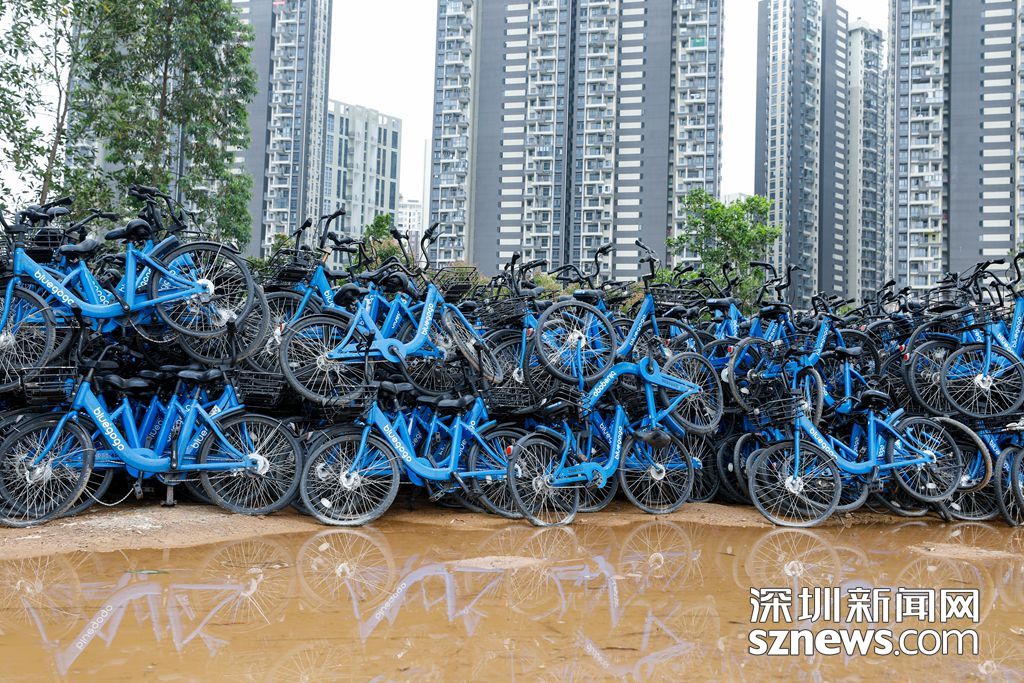 大量的小藍(lán)單車堆放在龍崗區(qū)水官高速旁的空地