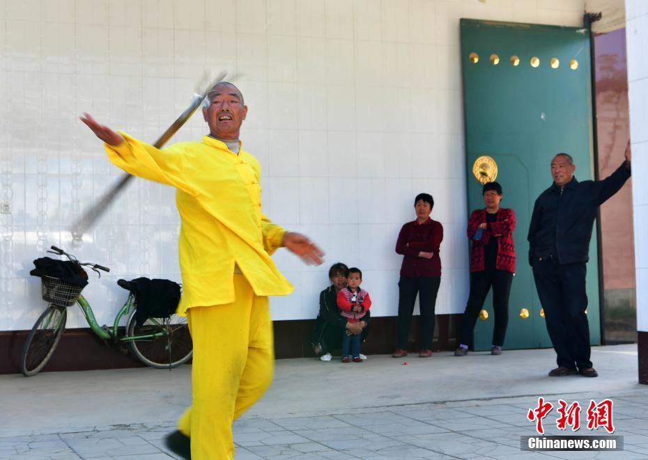 4月11日,在河北趙縣何莊,農民蘇煥未(左一)的“滾鋼叉”技藝表演吸引了圍觀者的眼球。67歲的蘇煥未出身武術世家,自幼練就一手出神入化的滾鋼叉絕技。滾鋼叉又叫鋼叉舞、耍鋼叉,以表演驚險著稱。老人的表演出神入化,鋼叉能耍出空中飛叉、滾蹚紅、金鉤釣魚、穿脖穿腰等十幾種花樣。蘇煥未表示,滾鋼叉因為練習非常辛苦,很少有年輕人愿意學,他希望該民間技藝得到相關部門保護。中新社記者翟羽佳 攝