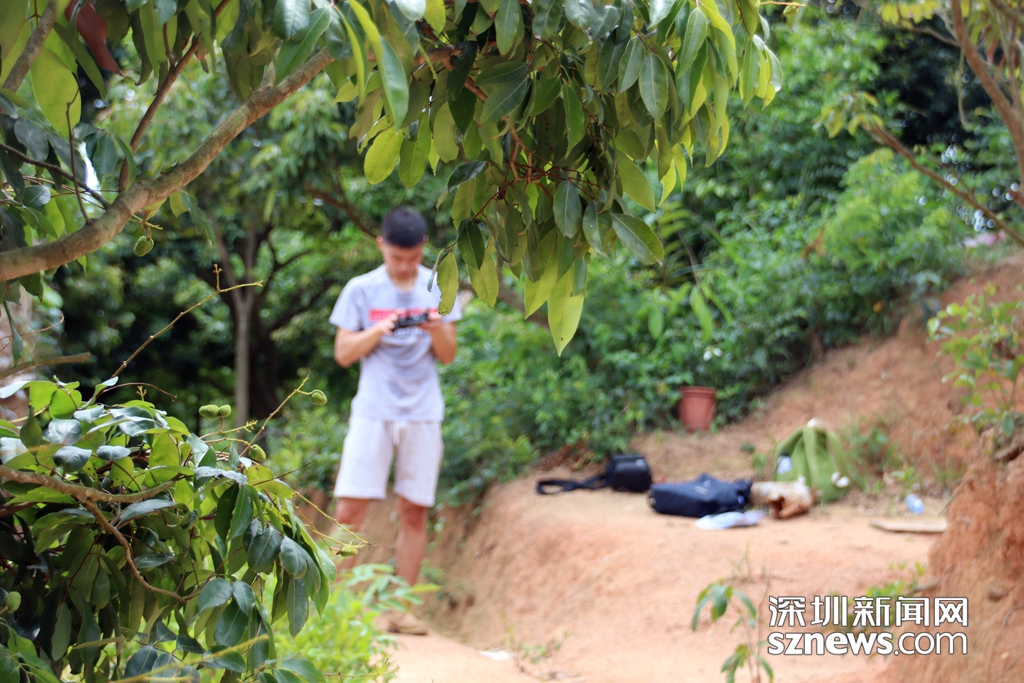 深圳新聞網(wǎng)記者正在操作無人機對羊臺山兩棟拆除后的違法建筑廢墟進行拍攝