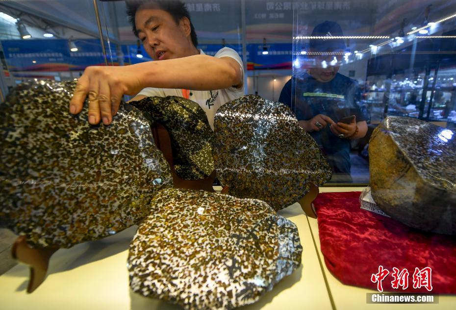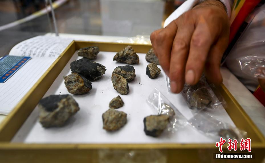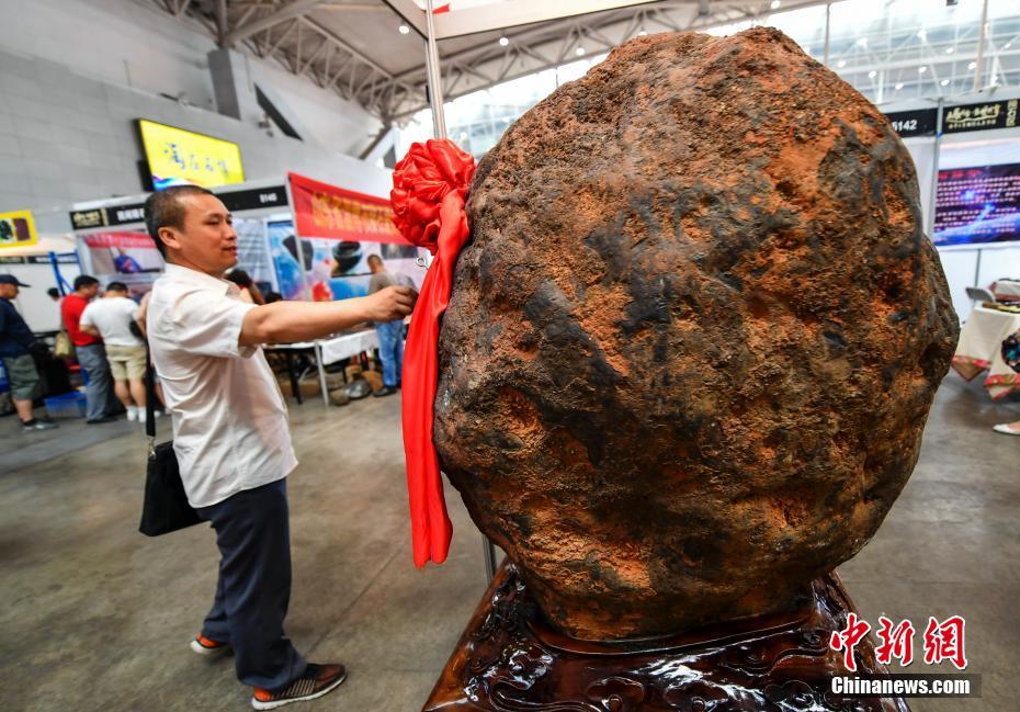 6月15日,第十一屆新疆觀賞石、和田玉精品博覽會在位于新疆烏魯木齊市紅光山的新疆國際會展中心開幕,本次博覽會參展種類涵蓋珠寶、玉石、礦石、隕石、觀賞石等,吸引眾多奇石玩家到場“以石會友”,打造獨(dú)具特色的“品石”盛宴。圖為曾引起各方關(guān)注,6月1日降落在云南西雙版納州景洪市的隕石“空降”本屆石博會展出。中新社記者劉新 攝