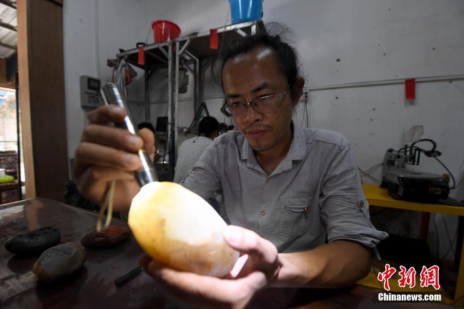 6月20日,廣西南寧市唐人文化街,錢思宇正在審料。1984年的錢思宇出生于湖南懷化,自小喜愛把玩石頭,受父輩影響,從2012年開始從事玉石雕刻工作至今。據(jù)了解,其設計的壯鄉(xiāng)玉雕作品,以人物為主,采用廣西當?shù)靥赜械氖?,結合壯文化中的銅鼓、壯錦等元素,通過刻畫“壯鄉(xiāng)人”的神態(tài),表達廣西特有的“壯鄉(xiāng)情”。中新社記者 俞靖 攝