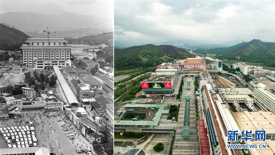 拼版照片:左圖為當(dāng)年深圳新建的聯(lián)檢大樓(資料照片,新華社記者盧炳輝攝);右圖為2018年6月12日無人機(jī)拍攝的羅湖口岸聯(lián)檢大樓片區(qū)(新華社記者毛思倩攝)。