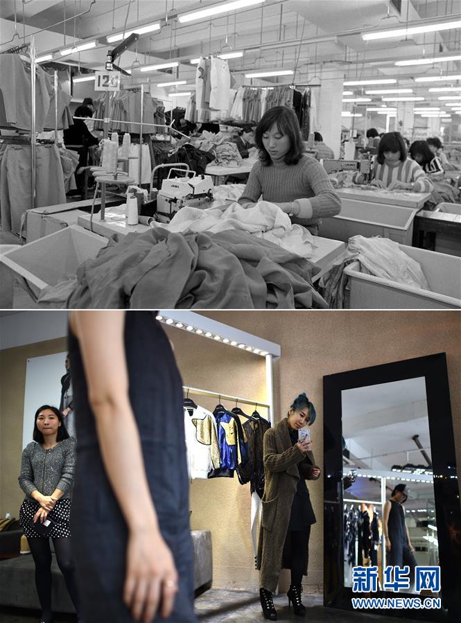 拼版照片:上圖為工人在深圳蛇口工業(yè)區(qū)一家服裝生產(chǎn)企業(yè)車間工作(資料照片,新華社記者段文華攝);下圖為2015年3月28日,獨(dú)立服裝品牌“Mansion魯遇”創(chuàng)始人魯遇(右)在位于深圳南山區(qū)的工作室內(nèi)查看模特試穿新款服裝(新華社記者毛思倩攝)。深圳從服裝代工基地轉(zhuǎn)型為服裝品牌聚集地,成為中國(guó)服裝產(chǎn)業(yè)轉(zhuǎn)型升級(jí)的樣本。新華社發(fā)