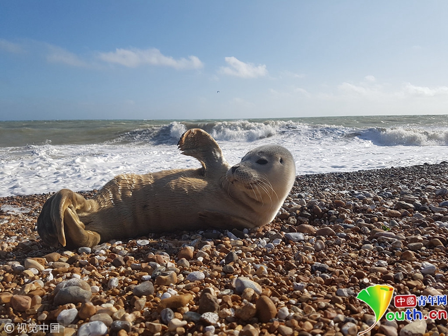 小海豹拍打尾巴,對(duì)著鏡頭“微笑”。