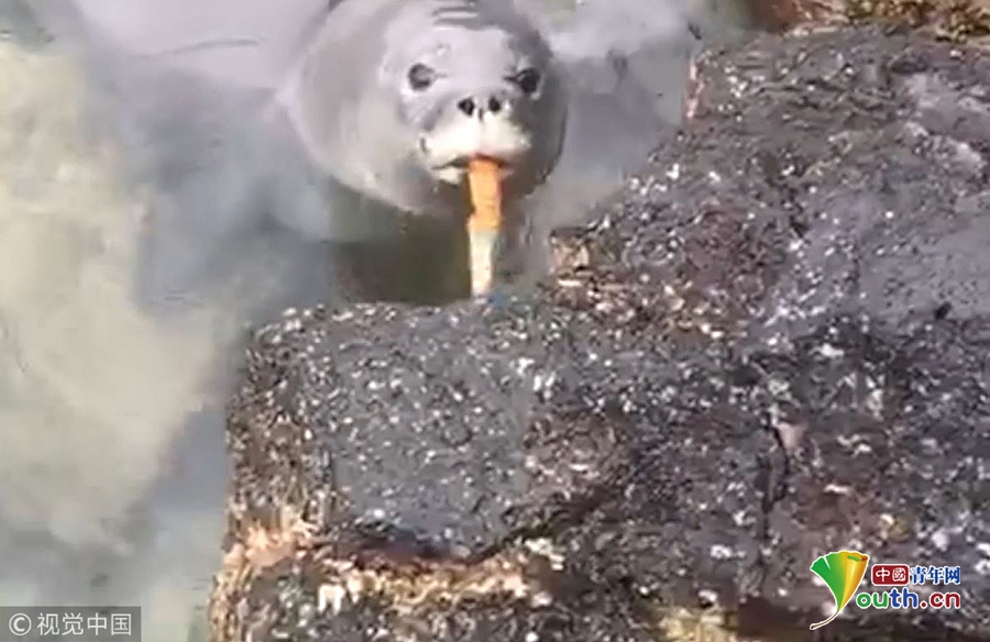 當?shù)貢r間2018年4月15日,美國夏威夷,一位保護區(qū)管理員發(fā)現(xiàn)一只小僧海豹銜著一把廢棄匕首的刀柄。這只小僧海豹剛斷奶,海洋哺乳動物中心和自然資源部的工作人員一直都在關(guān)注它。