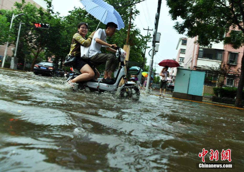 7月16日下午,河北石家莊一條馬路積水嚴(yán)重,民眾涉水騎行。當(dāng)日,該省氣象臺發(fā)布暴雨藍(lán)色預(yù)警,承德、雄安新區(qū)、廊坊北部、石家莊中西部、邢臺西部等多地遭受暴雨襲擊。中新社記者翟羽佳 攝