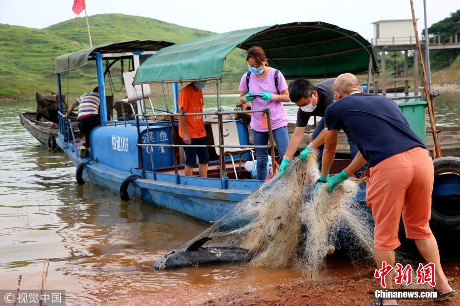 8月1日早晨,濂溪區(qū)護(hù)豚隊(duì)接到漁民打來的電話,在湖口縣鄱陽(yáng)湖的屏峰水域,發(fā)現(xiàn)水中絲網(wǎng)里有一頭江豚,懷疑已死亡。接到電話后,正在芳蘭湖清理水中定制網(wǎng)的濂溪區(qū)護(hù)豚隊(duì)隨即趕到現(xiàn)場(chǎng)。護(hù)豚隊(duì)隊(duì)員趕到現(xiàn)場(chǎng)時(shí)看到,事發(fā)地點(diǎn)距離岸邊約30米,一頭大江豚全身被水中的絲網(wǎng)纏住,無法動(dòng)彈。見此情況,大家將渾身纏滿絲網(wǎng)的江豚連網(wǎng)一起運(yùn)至岸邊,同時(shí)與中科院武漢水生生物所取得聯(lián)系。洪永林 攝 圖片來源:視覺中國(guó) 文字來源:九江新聞網(wǎng)