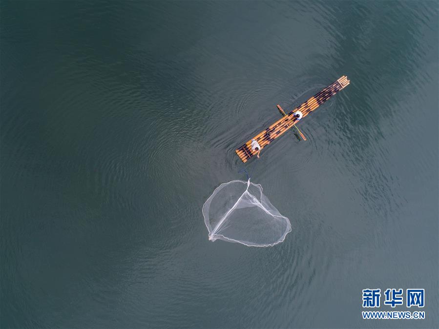 8月1日,淳安縣汾口鎮(zhèn)紅星村的漁民乘著竹排,在千島湖的支流武強(qiáng)溪上進(jìn)行撒網(wǎng)捕撈作業(yè)(無(wú)人機(jī)拍攝)。 新華社記者 徐昱攝