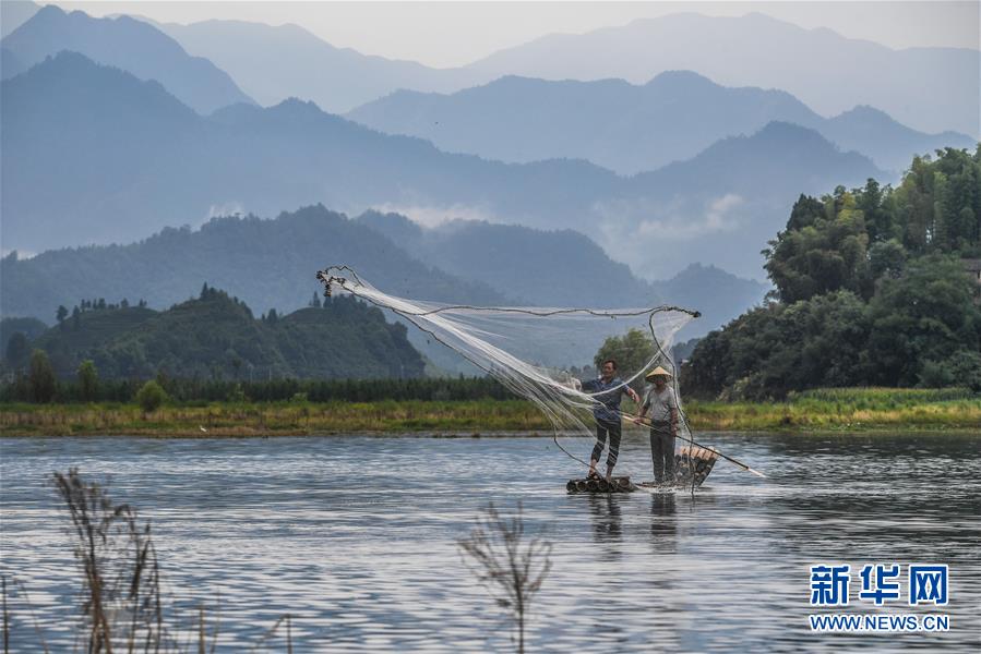 8月1日,淳安縣汾口鎮(zhèn)紅星村的漁民乘著竹排,在千島湖的支流武強(qiáng)溪上進(jìn)行撒網(wǎng)捕撈作業(yè)。 新華社記者 徐昱 攝