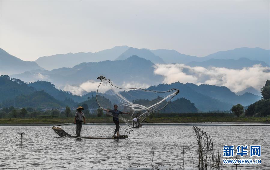8月1日,淳安縣汾口鎮(zhèn)紅星村的漁民乘著竹排,在千島湖的支流武強(qiáng)溪上進(jìn)行撒網(wǎng)捕撈作業(yè)。新華社記者 徐昱 攝