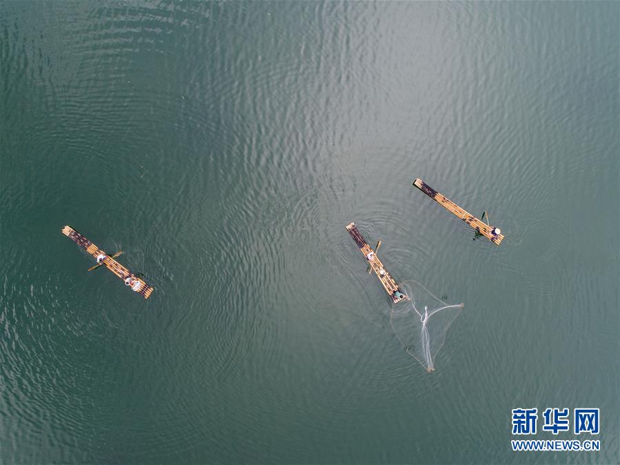 8月1日,淳安縣汾口鎮(zhèn)紅星村的漁民乘著竹排,在千島湖的支流武強溪上進行撒網捕撈作業(yè)(無人機拍攝)。新華社記者 徐昱攝