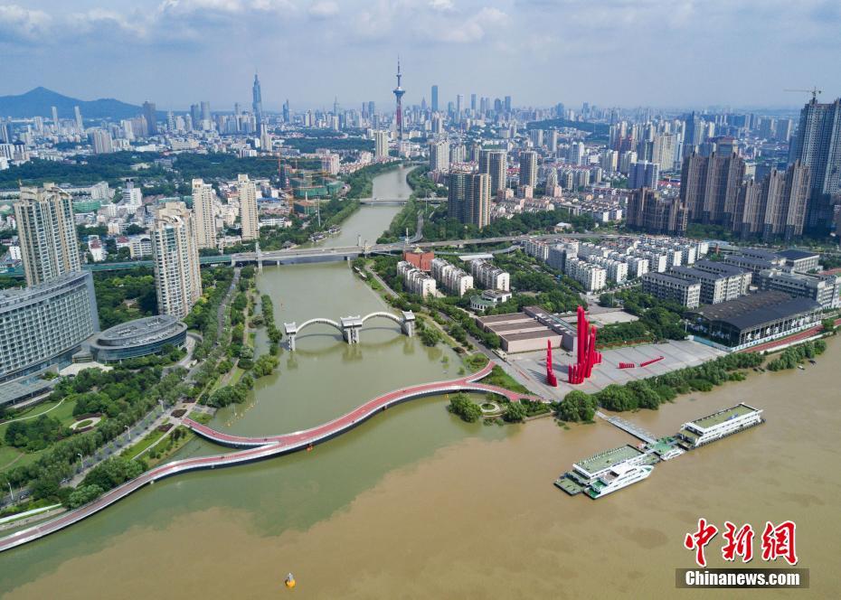 7月10日,航拍長江與南京秦淮河交匯處,江水與河水“涇渭分明”。當(dāng)日,江蘇水利廳發(fā)布的水情信息顯示,長江南京段水位已降至警戒線以下。中新社記者泱波 攝