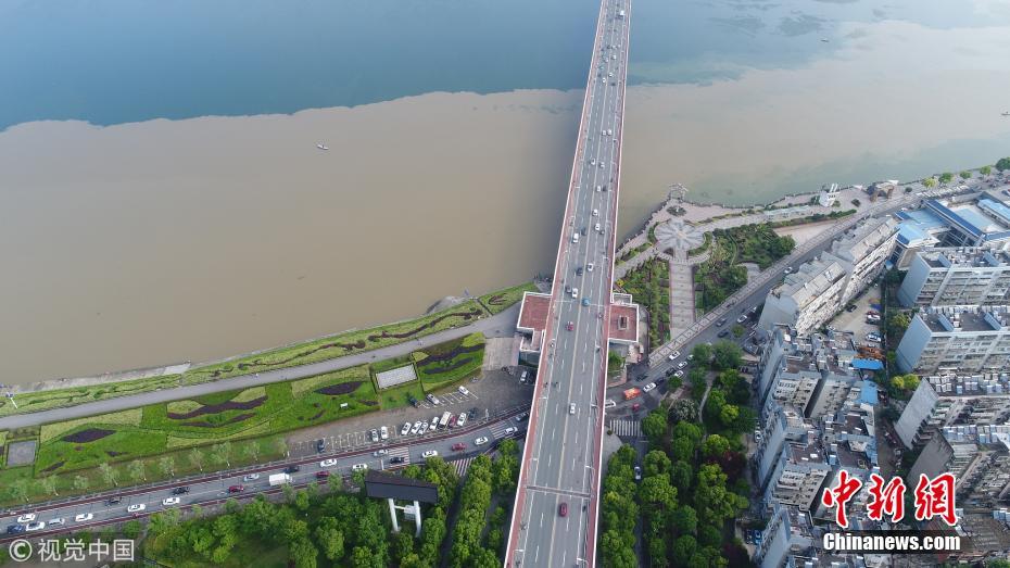 5月7日,湖北省襄陽市,無人機航拍的漢江長虹大橋處涇渭分明的漢江水面。強暴雨沖刷經(jīng)過去冬今春的田野地表積累的塵土,經(jīng)支流與主河道匯入時,充滿污泥的洪水與主河道上清澈的丹江水形成難得一見的涇渭分明景觀。王虎攝 圖片來源:視覺中國