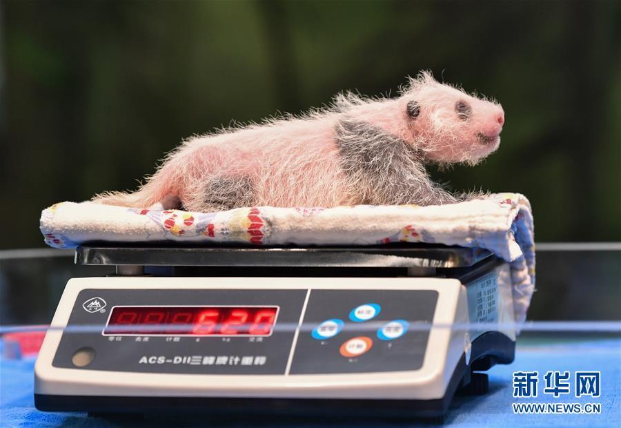 8月12日,在廣州長隆野生動物世界華南大熊貓繁育基地,新生大熊貓“婷仔”接受體檢稱重。 新華社記者 劉大偉 攝