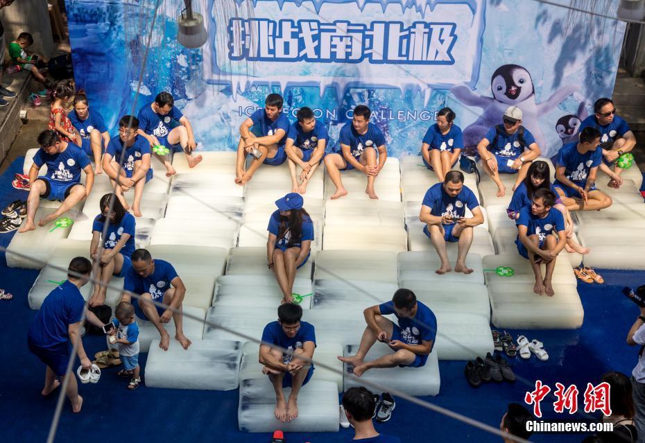 8月11日,在企鵝館舉行的決賽中,工作人員給參賽選手桶里加冰塊。當(dāng)日,一場(chǎng)充滿趣味性的“冰極挑戰(zhàn)賽”在武漢海昌極地海洋世界上演,參賽者們經(jīng)過(guò)“極地初體驗(yàn)”和“極寒企鵝館耐寒挑戰(zhàn)”兩個(gè)環(huán)節(jié),堅(jiān)持時(shí)間長(zhǎng)者獲勝。中新社記者張暢 攝