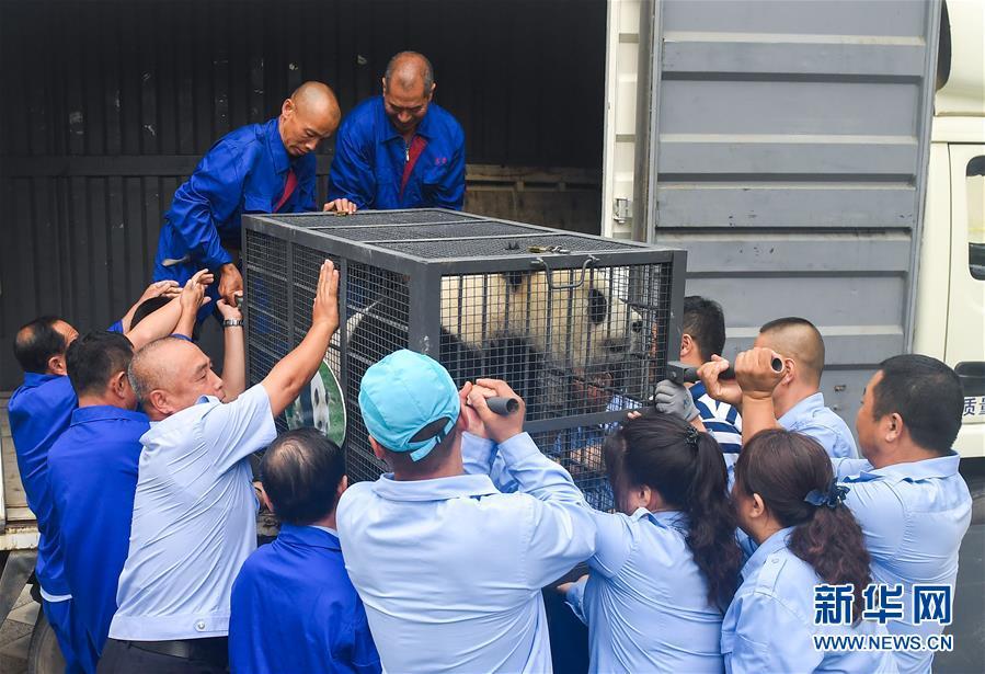 8月20日,工作人員推送大熊貓至運(yùn)輸車處。 新華社記者 許暢 攝