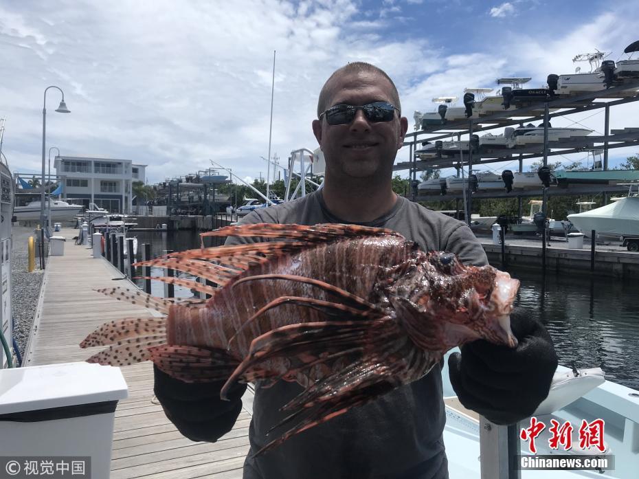 8月21日訊(具體拍攝時間不詳),近日,來自長島的Timothy Blasko打破了記錄,他捕獲了大西洋最重的獅子魚。37歲的Timothy Blasko是一名技術精湛的捕魚者,當天,他和朋友們在佛羅里達群島伊斯拉莫拉達海岸捕魚時,遇到了這條大魚。Timothy向朋友要來了魚叉,瞄準大魚的下方位置叉去,正中目標成功捕獲。當他們把這條魚和當天捕獲的其它魚排在一起時,他們猜測這條魚可能會破紀錄?!八喼笔仟{子魚中的哥斯拉!” Timothy描述道,“這條巨大的獅子魚重達3.1磅,刷新了大西洋迄今最重獅子魚的國家紀錄?!眻D片來源:視覺中國