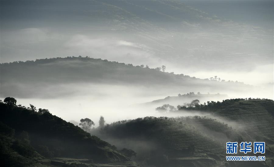 云霧繚繞的寧夏彭陽縣金雞坪梯田公園(7月17日攝)。新華社記者 王鵬 攝
