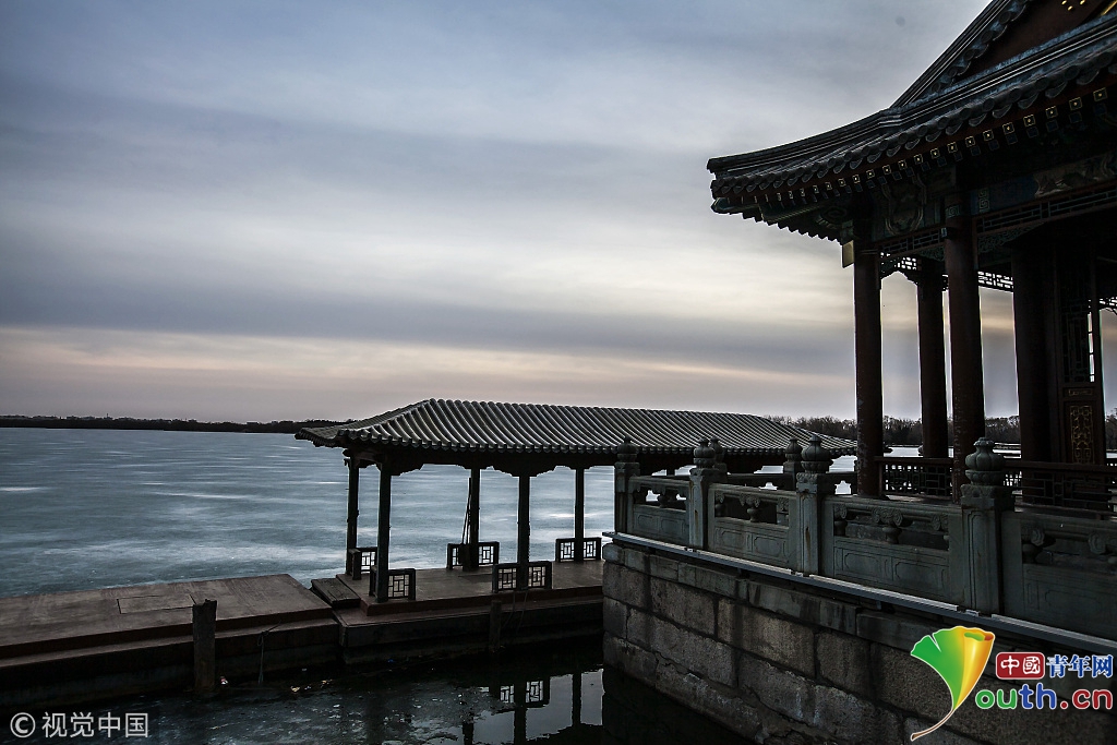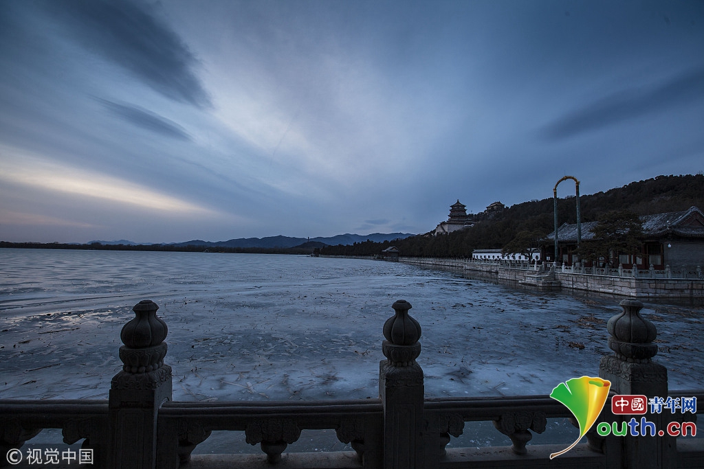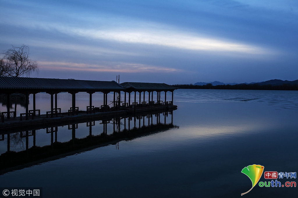 2018年2月23日,北京頤和園。當(dāng)天日落時(shí)分昆明湖上空出現(xiàn)夕陽(yáng)余暉的美景,夢(mèng)幻般的色彩將古老的皇家園林裝扮得美輪美奐,讓人流連忘返。來(lái)源:視覺(jué)中國(guó)