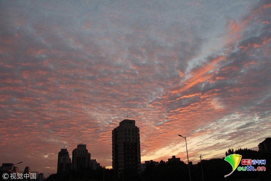 北京高積云點(diǎn)綴天空,和夕陽(yáng)一起勾勒出一張絕美“天空?qǐng)D”。