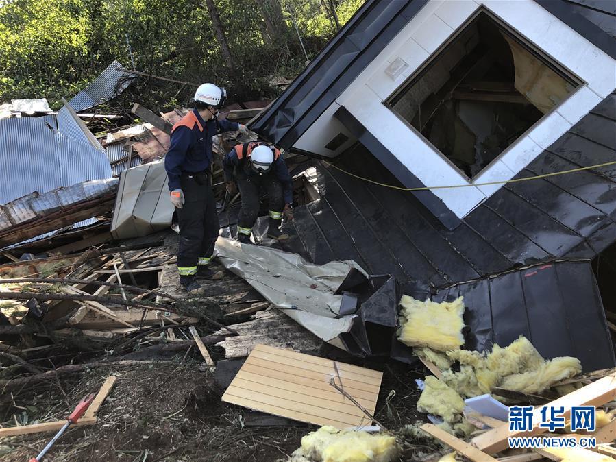 9月6日,在日本北海道厚真町,救援人員在一處倒塌的房屋附近搜救。