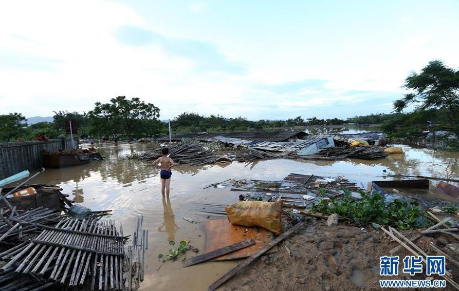 9月18日,在廣東省陽江市陽春市,一名兒童站在水浸的村莊里。 新華社記者張加揚(yáng)攝