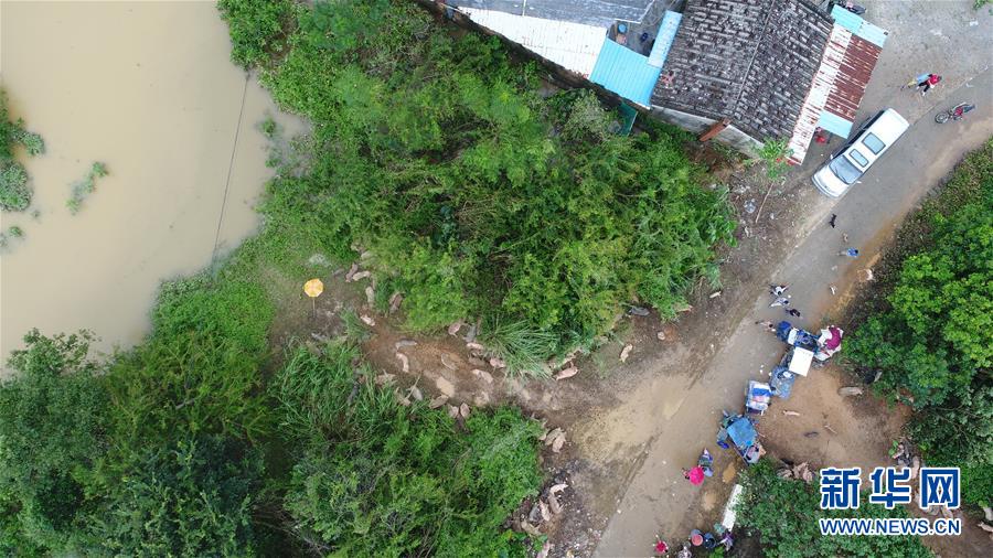 9月18日,在廣東省陽江市陽春市,村民將家畜轉移到高處(無人機拍攝)。 新華社記者張加揚攝